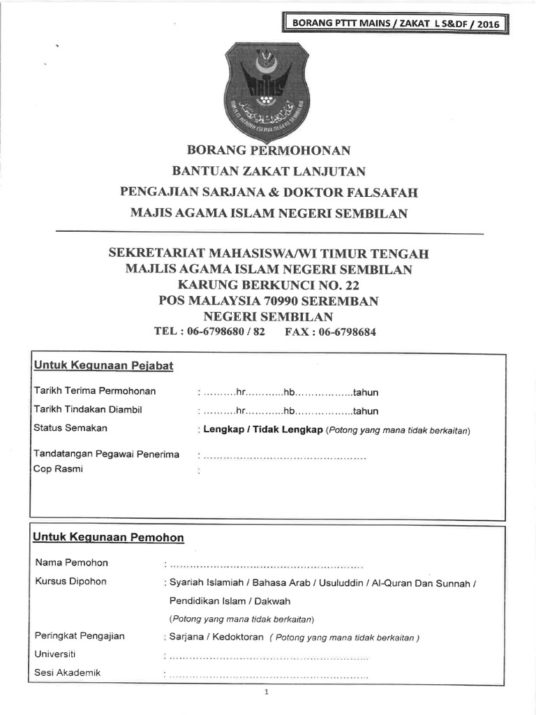 Borang Permohonan Bantuan Zakat Pengajian Sarjana Dan Doktor Falsafah 2016