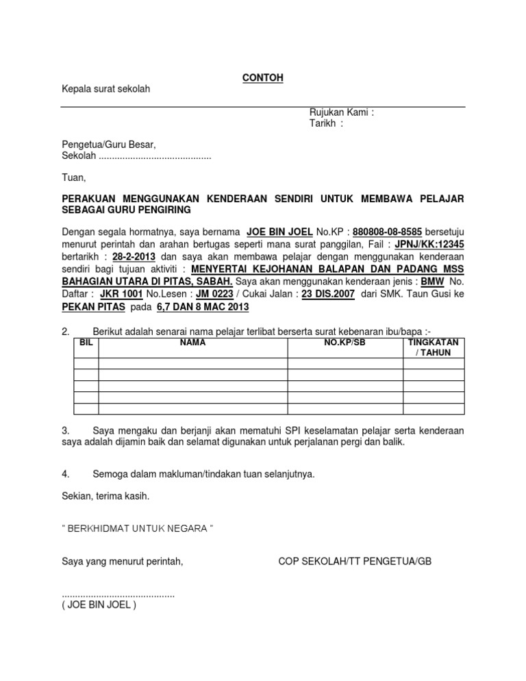 Contoh Borang Kebenaran Bawa Kenderaan