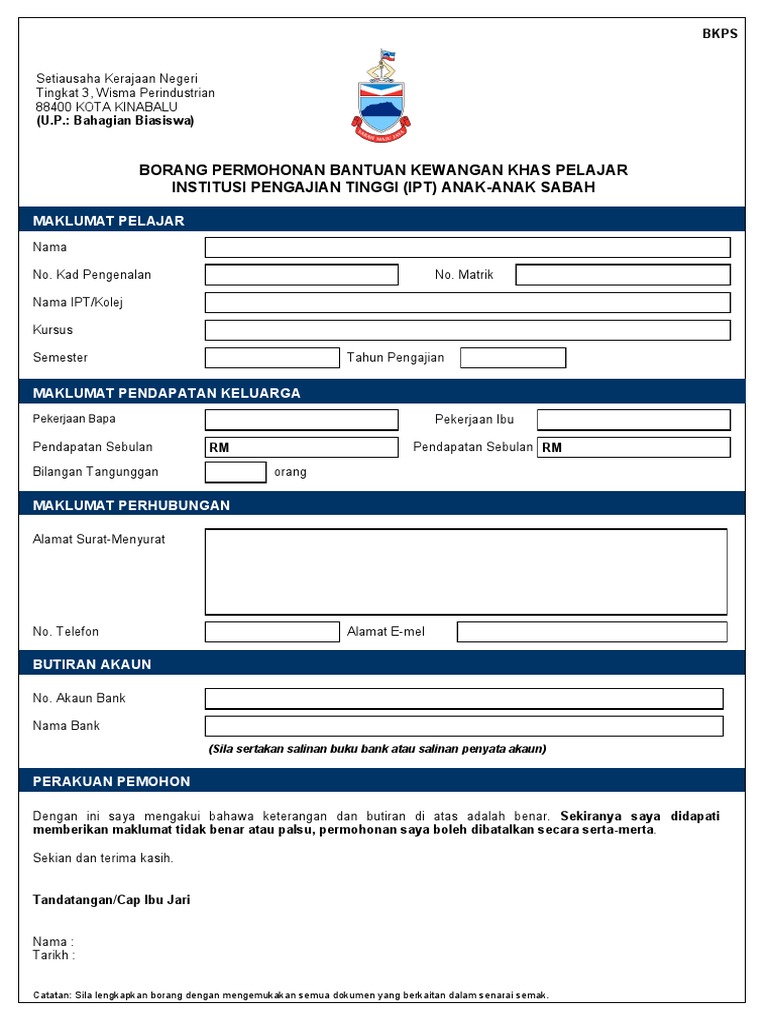 Borang Permohonan Bantuan Kewangan Khas Pelajar Institusi Pengajian Tinggi Negeri Sabah