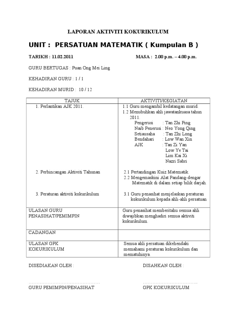 Contoh Borang Laporan Aktiviti Kokurikulum