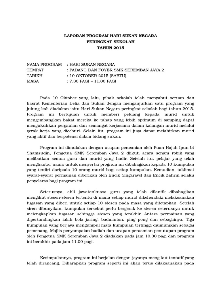 Doc Laporan Hari Sukan Negara Peringkat Sekolah 2016 Sri Bekelam Academia Edu