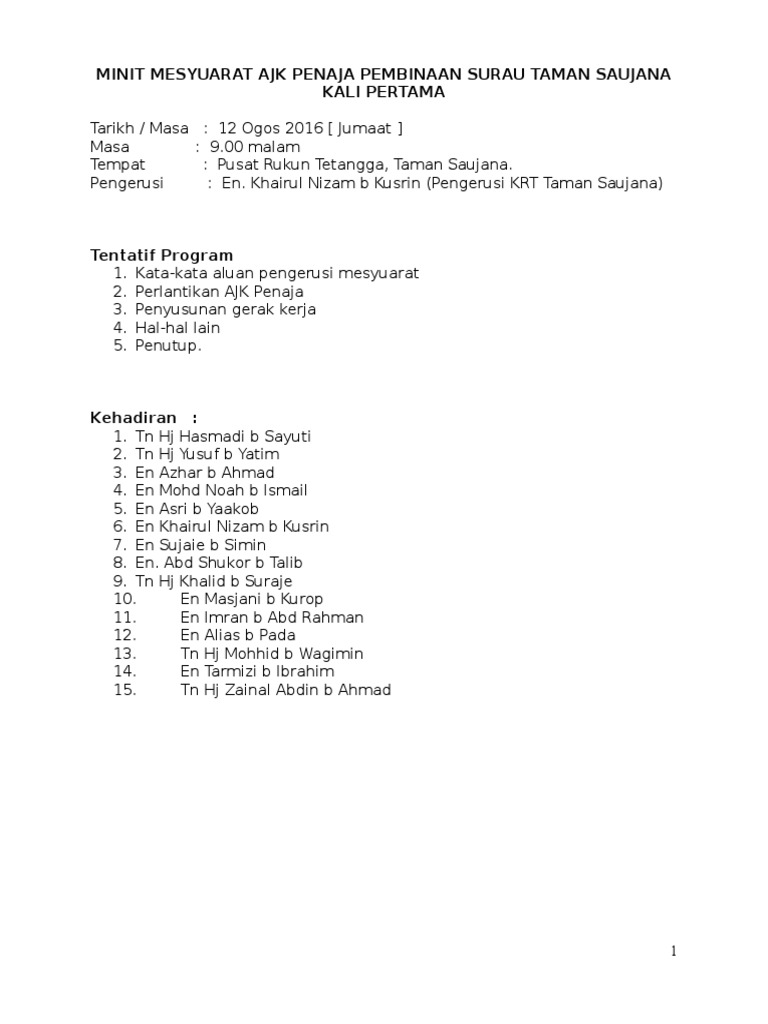 Contoh Minit Mesyuarat Kali Pertama Pelantikan Ajk Surau