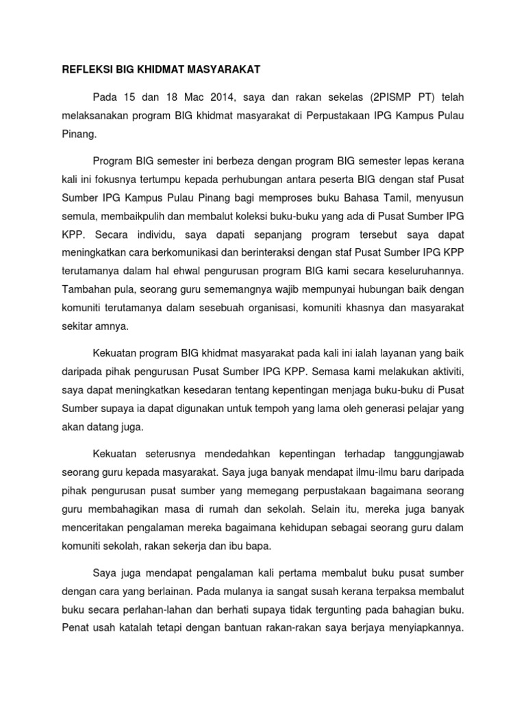 Refleksi kendiri khidmat masyarakat big pismp sem 2 jun 2013 nama. Perlantikan ahli ahli jawatankuasa untuk melaksanakan program ini dilakukan pada hari yang sama. Saya memilih untuk melaksanakan tugasan ini kerana kami diberi peluang untuk memilih program khidmat masyarakat yang ingin dilaksanakan. Kertas kerja projek khidmat masyarakat 2011.