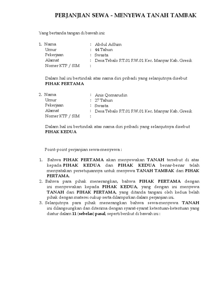 Untuk dapat mendownload contoh surat perjanjian sewa tanah dalam format doc silahkan klik link yang tersedia dibawah ini. 3 bayaran sewa 4 obligasi tuan tanah 5 obligasi penyewa 6 penamatan penyewaan 7 force majeure 8 jawatankuasa penyelesaian pertikaian 9 timbang tara 10 pelbagai. Begitupula dengan penyewaan sawah dan lahan pertanian untuk digarap pembuatan surat perjanjian sewa tanah pertanian atau surat perjanjian tanah sawah tentu diperlukan. Contoh perjanjian kontrak tanah bermacam macam penggunaannya seperti misalnya terdapat surat tanah dan bangunan maka anda harus membuat surat perjanjian sewa tanah dan bangunan.