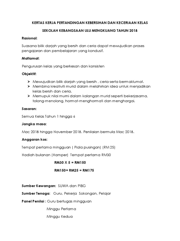 Kertas Kerja Pertandingan Kebersihan Dan Keceriaan Kelas Sk