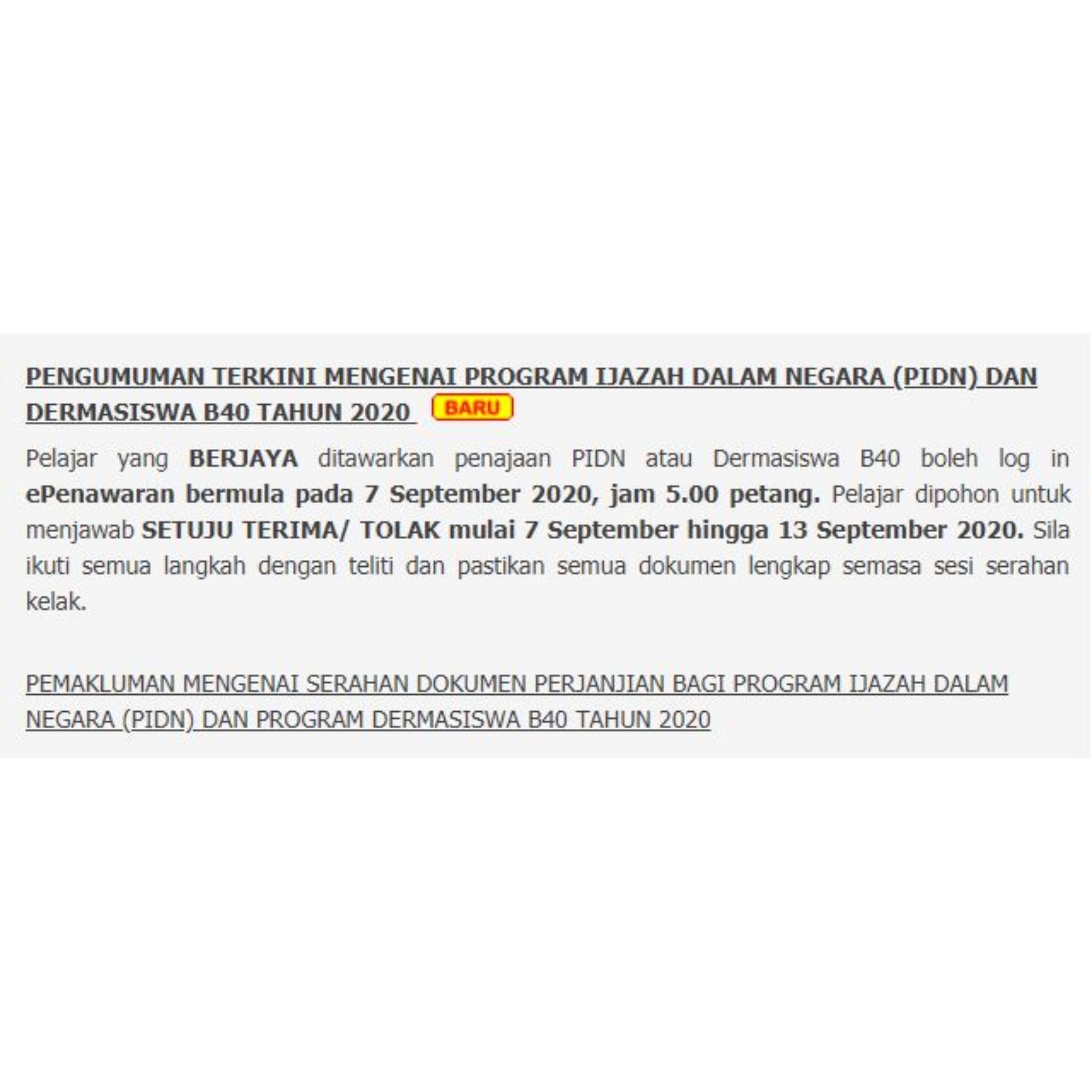 Jab Per Awam Jpa On Twitter 1 4 Pengumuman Terkini Mengenai Program Ijazah Dalam Negara Pidn Dan Dermasiswa B40 Tahun 2020 Pelajar Yg Berjaya Ditawarkan Penajaan Pidn Atau Dermasiswa B40 Boleh Log In Epenawaran