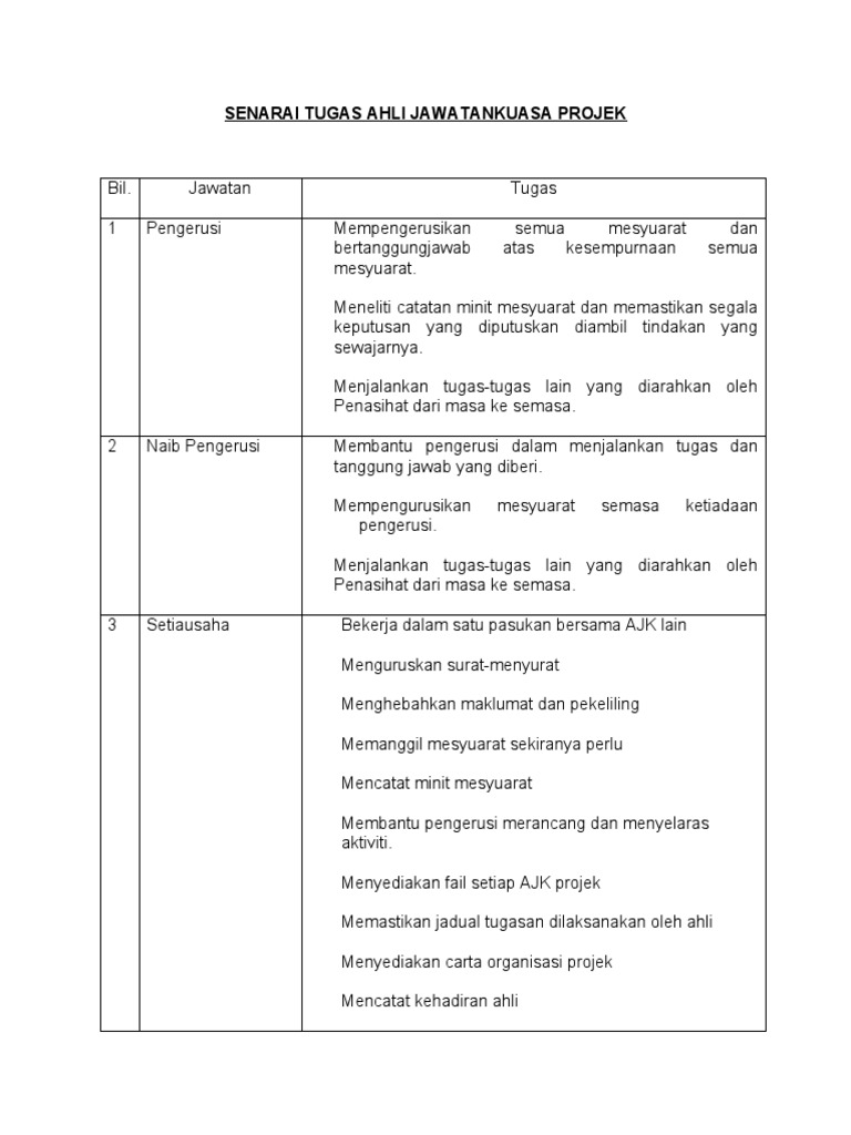 Senarai Tugas Ahli Jawatankuasa Projek