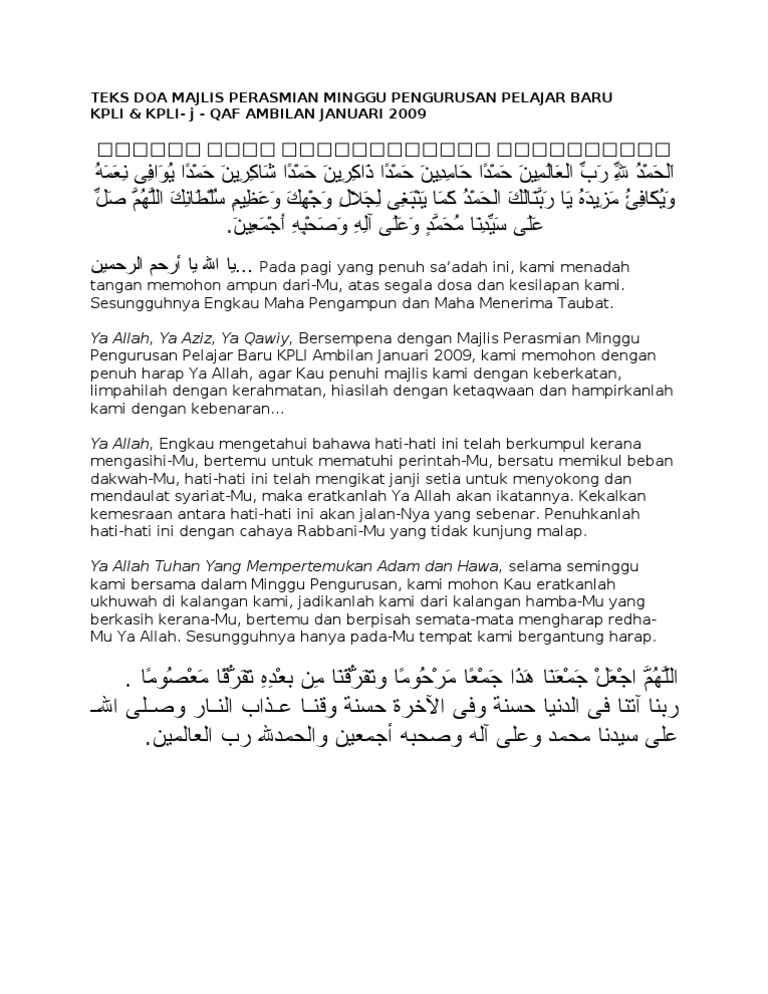 Teks doa majlis perasmian. Doa perasmian majlis march 2012 1 january 2012 1 2011 15 december 2011 2 october 2011. Namun begitu sebelum menggunakan doa ini untuk sebarang majlis di tempat kerja anda pastikan anda mematuhi tatacara membaca doa untuk majlis rasmi atau separuh rasmi yang dikeluarkan oleh jakim. 9 2 isi kandungan doa i. Doa perasmian penutup minggu pendidikan khas allahumma ya munzilar rahmah wa ya fatihal barakah rasa kesyukuran penuh kehambaan kami persembahkan hanya layak kepada mu dengan inayah dan rahmat mu dapat kami menyusun seminar permata hati ku pada hari ini kurniakanlah pertemuan kami dalam majlis ini dengan keberkatan dan limpahan rahmat mu agar.